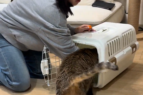 訓練師 Abby 建議,外出籠平時可以不收起來,將貓包常態性地擺放在家中,並在裡面放置貓咪喜愛的毯子或主人的舊衣服,讓貓咪習慣外出籠的存在。