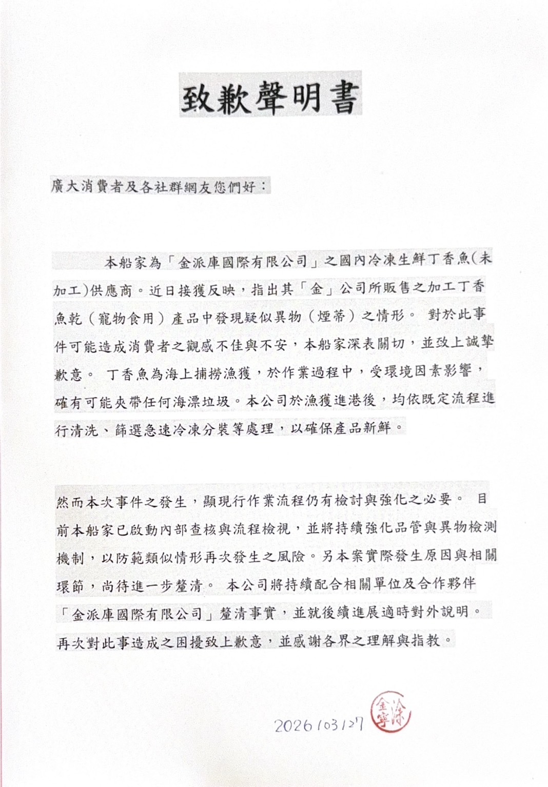 丁香魚廠商聲明文